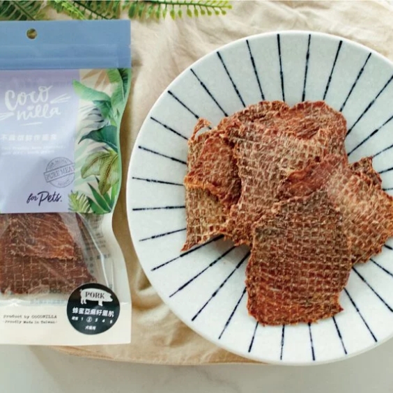豬大里肌與野蜂蜜及亞麻籽混合烘製,營養成份可維持活力及幫助消化,肉質口感細緻,是毛孩最愛的香甜滋味。為純天然手工寵物零食。